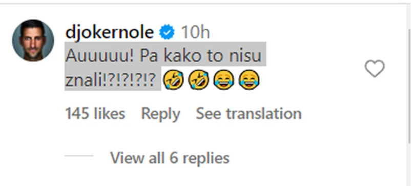 "Auuuuu! Pa kako to nisu znali!?!?!?!?", napisao je Đoković uz emotikone koji plaču od smijeha.
