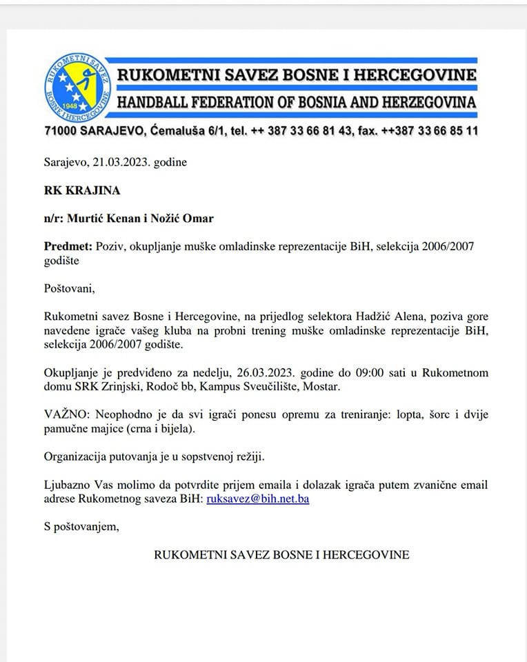 Jutros je na adresu našeg kluba stigao poziv za naša dva igrača koji nastupaju za naš seniorski tim.