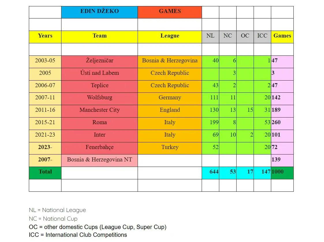 IFFHS piše da je Džeko odigrao 861 utakmicu za osam različitih klubova, dok je za reprezentaciju BiH upisao 139 mečeva.