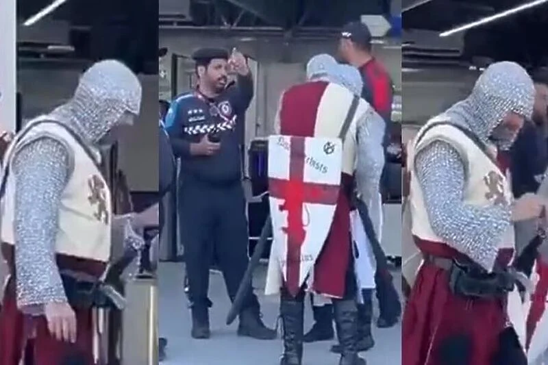 Naime, na društvenim mrežama pojavile su se fotografije dvojice engleskih navijača, obučenih kao krstaši, koje je izbacilo obezbjeđenje.