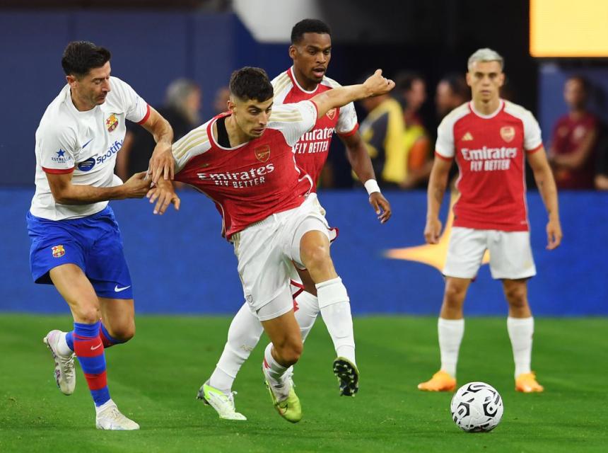 Sjajan meč, koji je odigran na stadionu SoFi, bolje otvaraju nogometaši Barcelone, koji već u sedmoj minuti golom Lewandowskog dolaze u vodstvo od 1:0. Ipak, slavlje je trajalo samo šest minuta, pošto je na drugoj strani Saka pogodio za 1:1.
