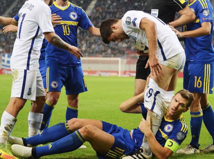 Tada je Grk isprovocirao i oborio napadača bh. reprezentacije Edina Džeku koji mu je iz sjedećeg položaja skinuo šorc i ostavio ga u donjem vešu.