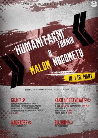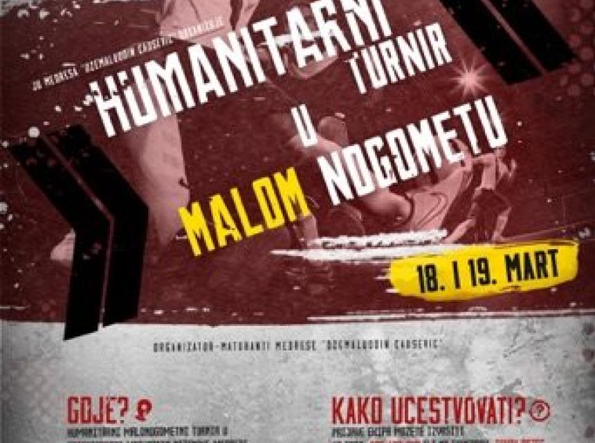 Maturanti JU "Džemaluddin ef. Čaušević" Cazin organiziraju humanitarni srednjoškolski turnir u malom nogometu, koji će se održati 18. i 19. marta (ponedjeljak i utorak) u dvorani Medrese.