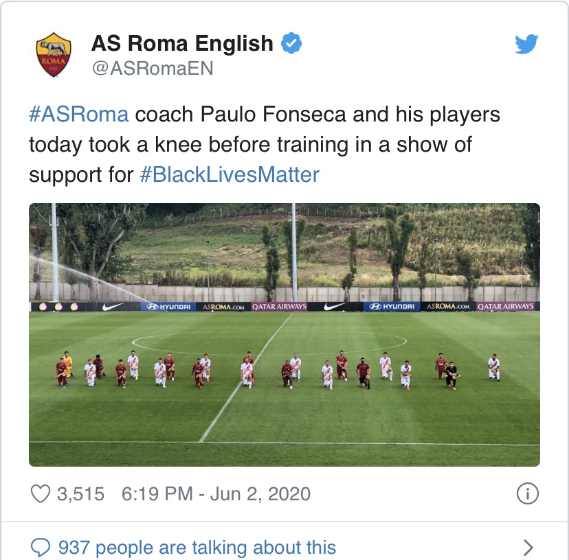 Roma i njeni brojni fudbaleri, među kojima je i Edin Džeko objavili su fotografije na društvenim mrežama na kojima kleče na jednom koljenu u znak podrške protiv rasizma u Sjedinjenim Američkim Državama.