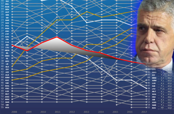 Na evropskoj nogometnoj sceni tonemo nezaustavljivo. UEFA koeficijent ranking odražava prosjek rezultata klubova u posljednjih pet sezona u takmičenjima koje organizuje UEFA. Ne samo da nikada niti jedan naš klub nije osigurao nastup u grupnoj fazi nekog evropskog takmičenja, nego kako vrijeme odmiče tonemo sve dublje na UEFA-inim rang listama.