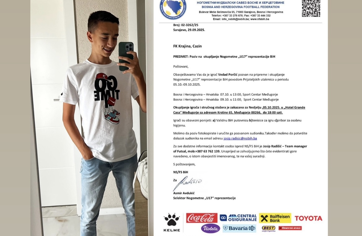 Veliko priznanje stiglo je za mladog fudbalera FK Krajina Cazin – kadet Vedad Porčić dobio je poziv u U17 reprezentaciju Bosne i Hercegovine.