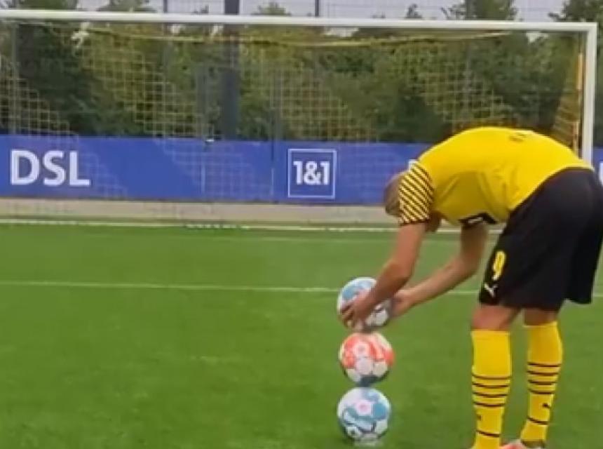 I zvanični Twitter nalog Bundeslige je objavio video na kojem je Haland namjestio tri lopte, jednu na drugoj, a onda je svakom pogodio tačno u metu koja je bila u gornjem desnom ćošku.