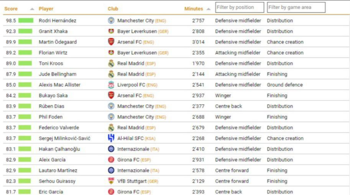 Prvi igrač na listi sa najvećim zabilježenim utjecajem na igru je Brazilac Rodri. On nastupa za Mančester Siti.