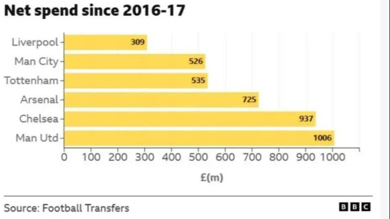 "Crveni đavoli" su u proteklih devet godina potrošili 1,2 milijarde eura, dok ih prati Čelzi s 1,1 milijardom eura neto potrošnje.
