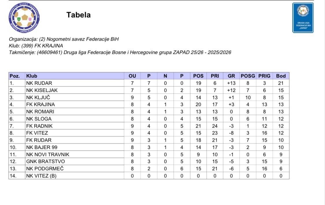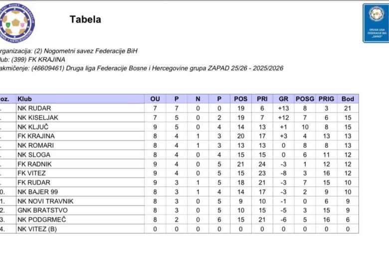 Krajina je ovim trijumfom dodatno učvrstila svoju poziciju među vodećim ekipama lige. Nakon osam odigranih kola, Cazinjani imaju 13 bodova i nalaze se na četvrtom mjestu, odmah iza vodećih Rudar, Kiseljaka i Ključa.