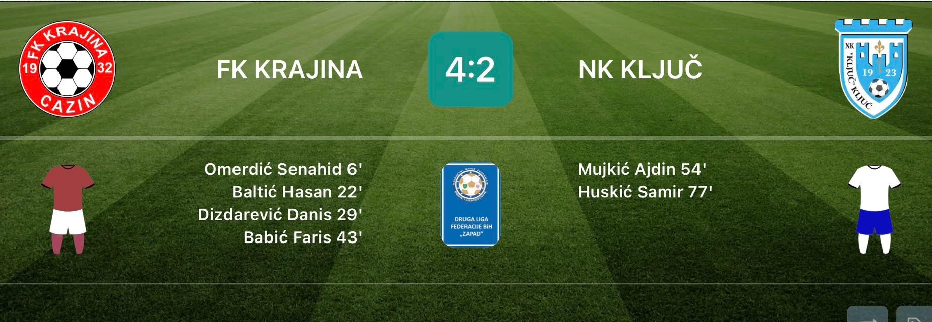 Na Gradskom stadionu u Cazinu danas je odigran uzbudljiv derbi između FK Krajine i NK Ključa, u kojem su domaći nastavili impresivan niz bez poraza. Krajina je slavila rezultatom 4:2, potvrdivši još jednom da zasluženo kotira pri samom vrhu tabele Druge lige Federacije BiH – grupa Zapad.
