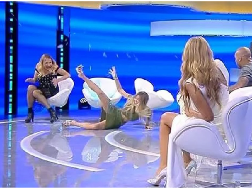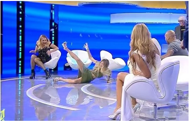 Kada se ustala i pokušala da mu uzvrati Diletta se okliznula i pala što je nasmijalo sve prisutne u studiju.