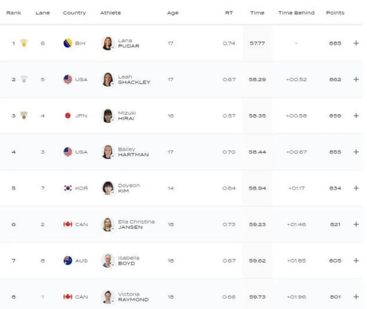 Lana je utrku završila s vremenom 57.77, što je za 00.52 sekundi bilo brže od Amerikanke Leah Shackley. Na trećem mjestu je završila Japanka Mizuki Hirai s vremenom 58.35.