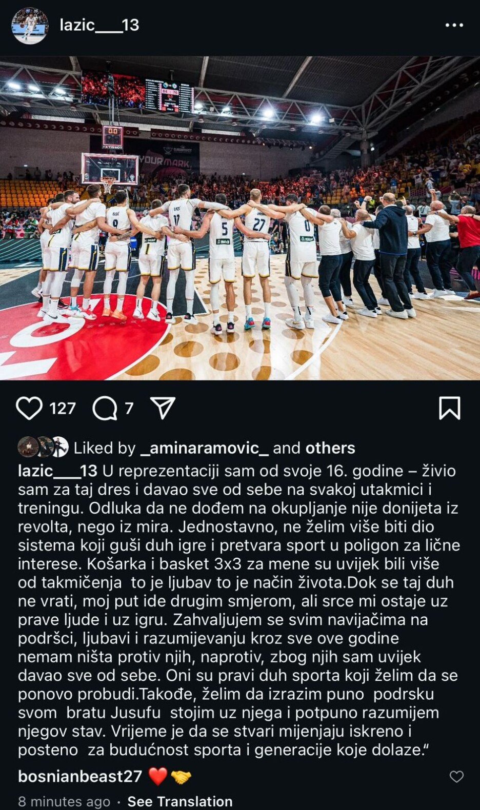"U reprezentaciji sam od svoje 16. godine - živio sam za taj dres i davao sve od sebe na svakoj utakmici i treningu. Odluka da ne dođem na okupljanje nije donijeta iz revolta nego iz mira. Jednostavno ne želim više biti dio sistema koji guši duh igre i pretvara sport u poligon za lične interese. Košarka i basket 3x3 za mene su uvijek bili više od takmičenja, to je ljubav, to je način života. Dok se taj duh ne vrati, moj put ide drugim smjerom, ali srce mi ostaje uz prave ljude i uz igru", napisao je Lazić na društvenim mrežama i dodao: