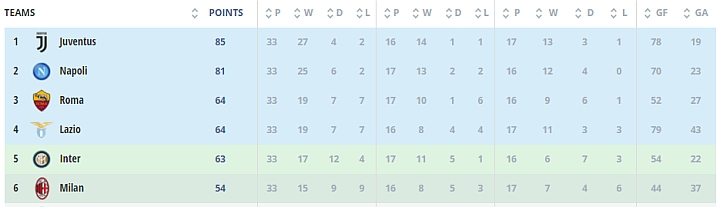 Rimski klubovi imaju identičan skor ove sezone (19 pobjeda, po sedam remija i poraza), Lazio ima impresivnu gol razliku 79:43 (najefikasniji klub u ligi), ali Roma je u boljoj poziciji zbog boljeg međusobnog omjera (2:1, 0:0). Inter je u dosadašnje 33 utakmice doživio samo četiri poraza, ali ima čak 12 remija i gol razliku 54:22.
