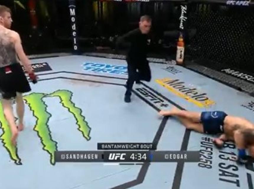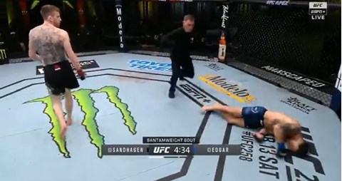Sandhagen je letećim koljenom pogodio slavnog borca nakon što je Edgar krenuo u napad i borba je bila gotova. Udarac u bradu bio je prejak i Edgar je pao na pod.