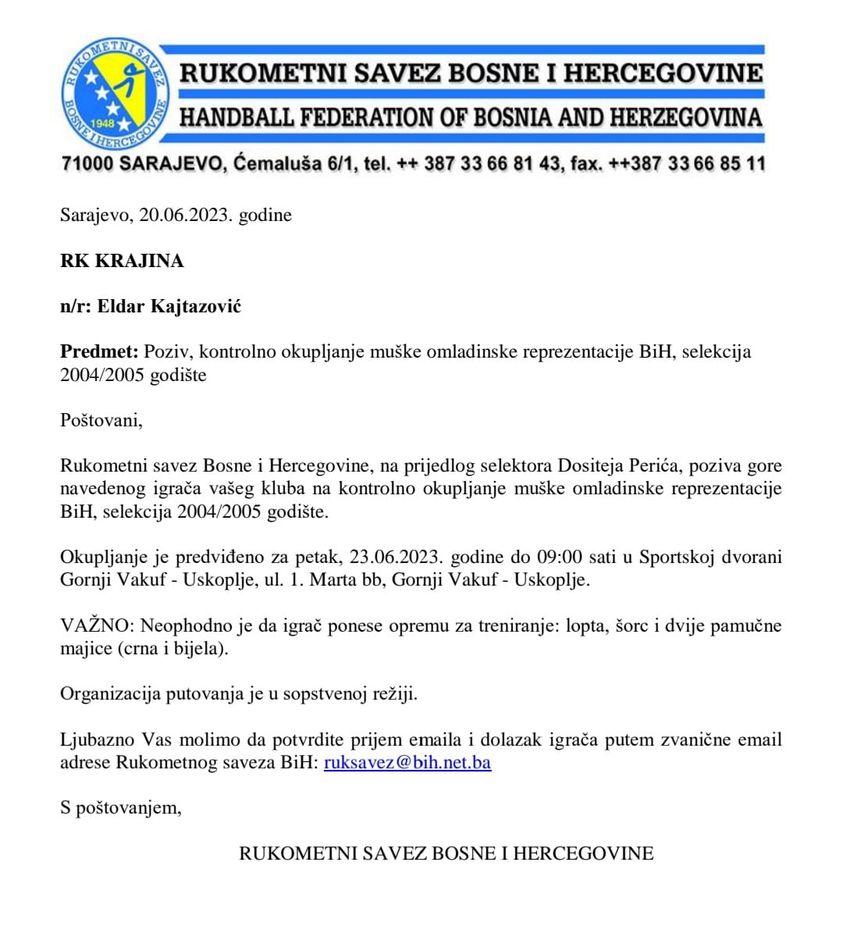 Golman našeg seniorskog tima Eldar Kajtazović dobio je poziv za okupljanje rukometne reprezentacije Bosne i Hercegovine, selekcija 2004/05 godište.