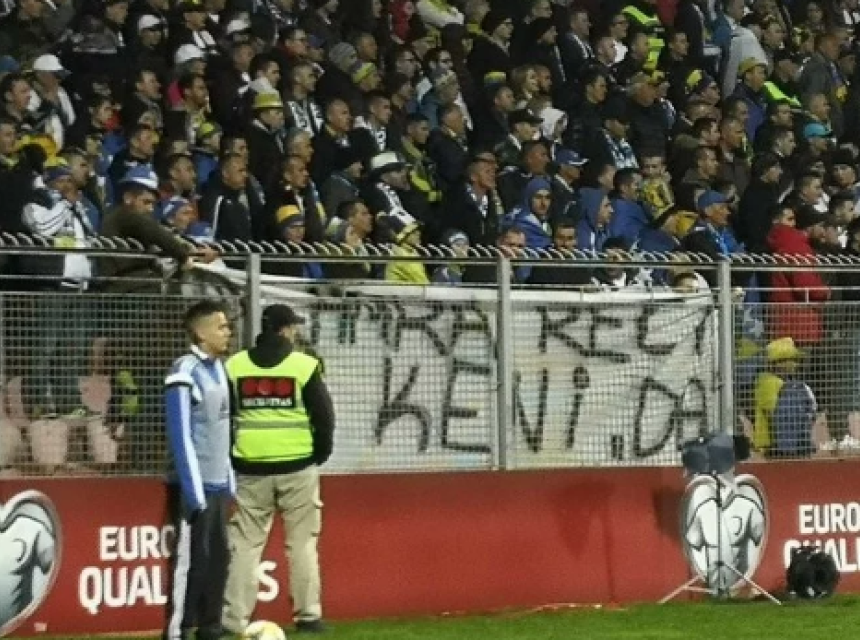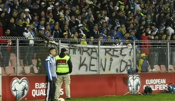 Među brojnim zastavama, šalovima i drugim rekvizitima sa motivom naše zastave, na tribinama je osvanuo i transparent sa natpisom "Amra reci Keni 'Da'".