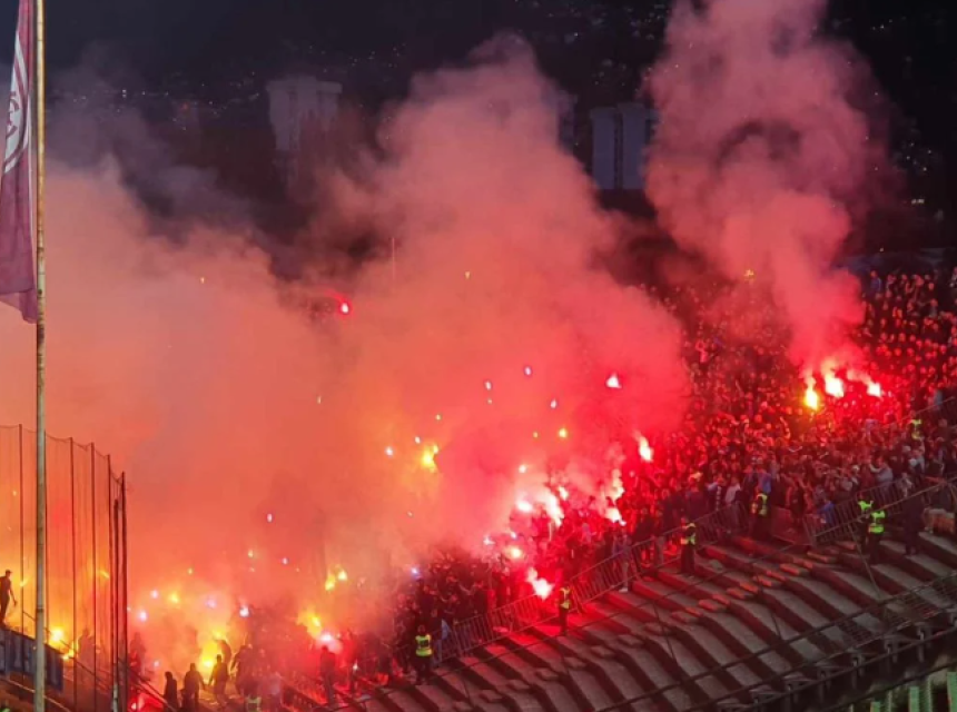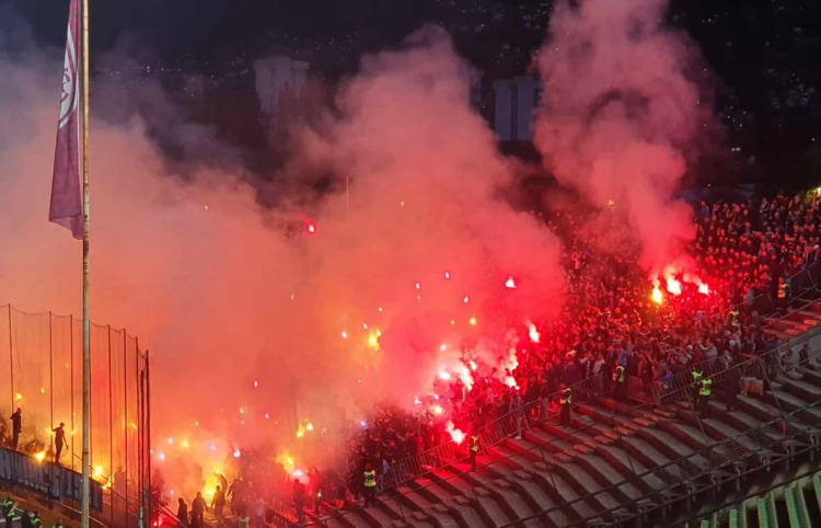 Na južnoj tribini Koševa je 2200 navijača Željezničara koji su u korteu stigli na stadion. Briljiraju na svom dijelu tribina i zaista prave spektakl, te su podrška svojim igračima.