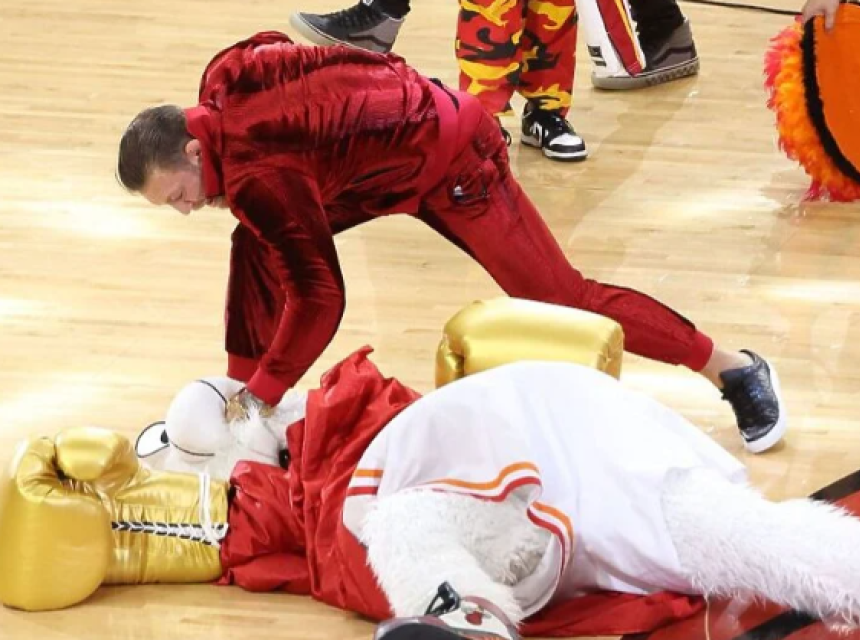 Kontroverzni Irac je i ovaj put izazvao veliku pažnju, a na poluvremenu je napravio show s Miamijevom maskotom Burniejem.