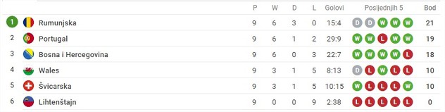 Kako stvari stoje, prvo mjesto u ovoj grupi zauzet će Rumunija kojoj je protiv Lihtenštajna na domaćem terennu večeras (meč počinje u 20:00 sati) dovoljan samo bod zbog boljeg međusobnog omjera od Portugala.