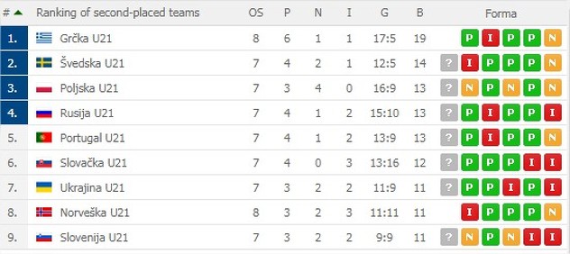 Trenutni raspored najboljih drugoplasiranih reprezentacija: