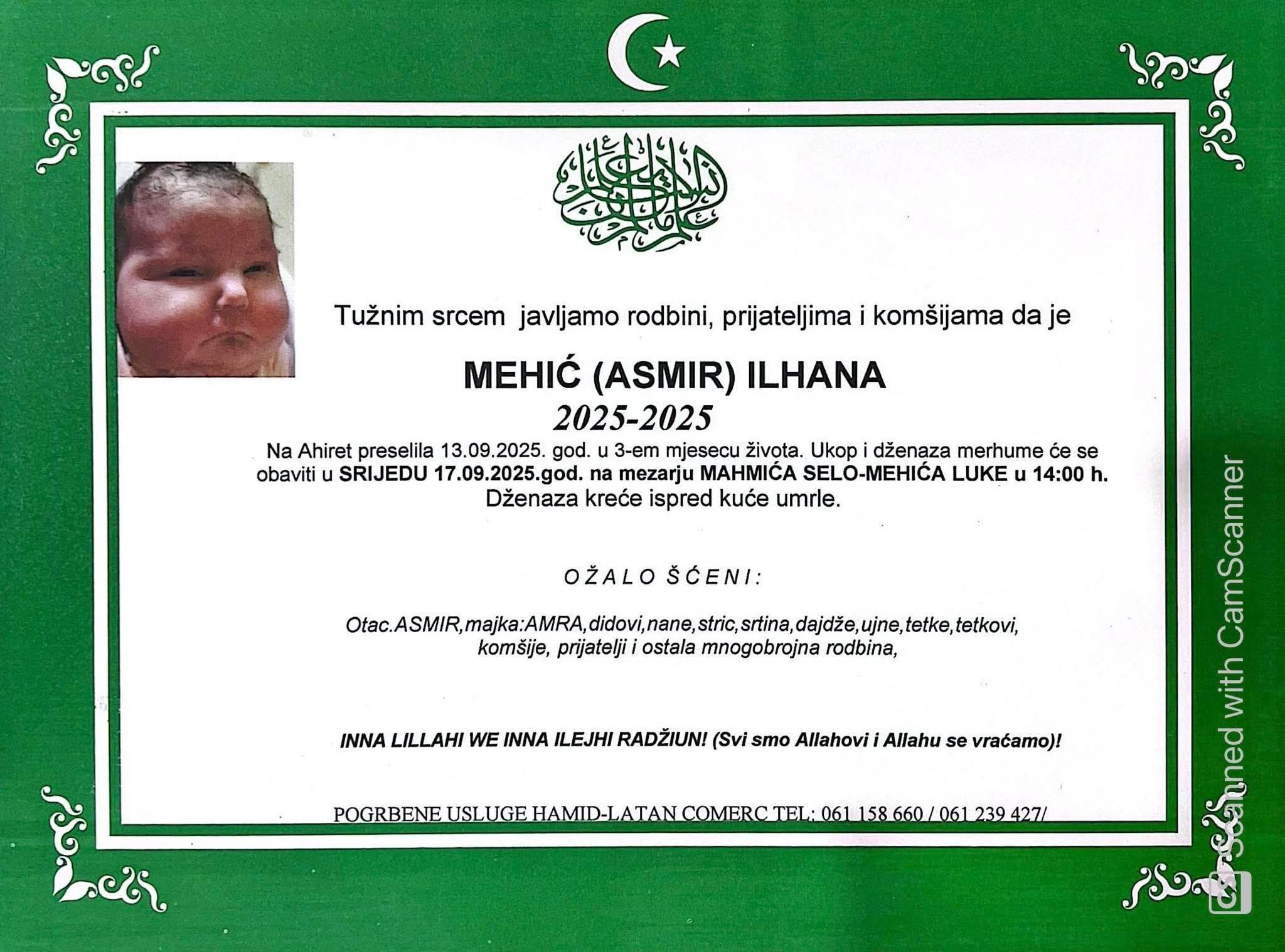 Na Ahiret preselila 13.09.2025. god. u 3-em mjesecu života. Ukop i dženaza merhume će se obaviti u SRIJEDU 17.09.2025. god. na mezarju MAHMIĆA SELO – MEHIĆA LUKE u 14:00 h.