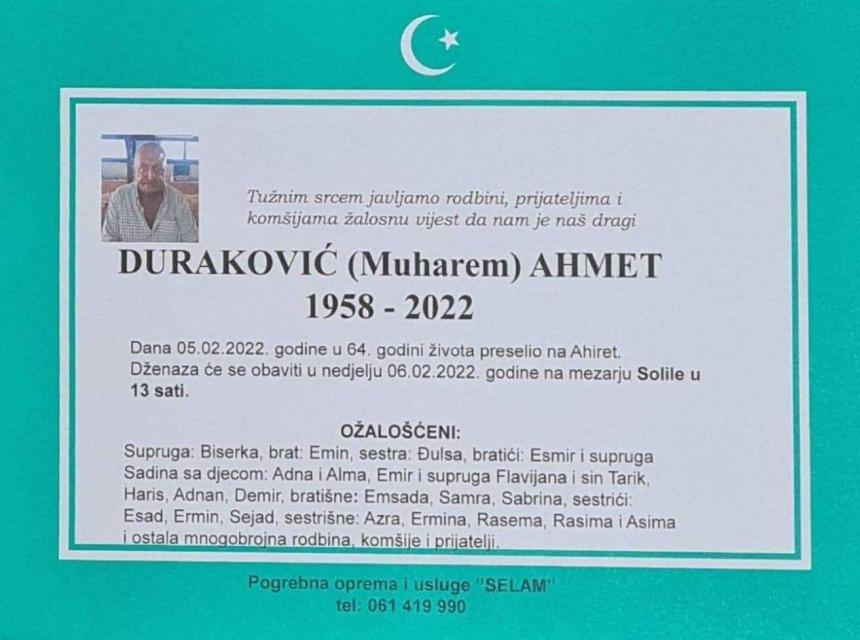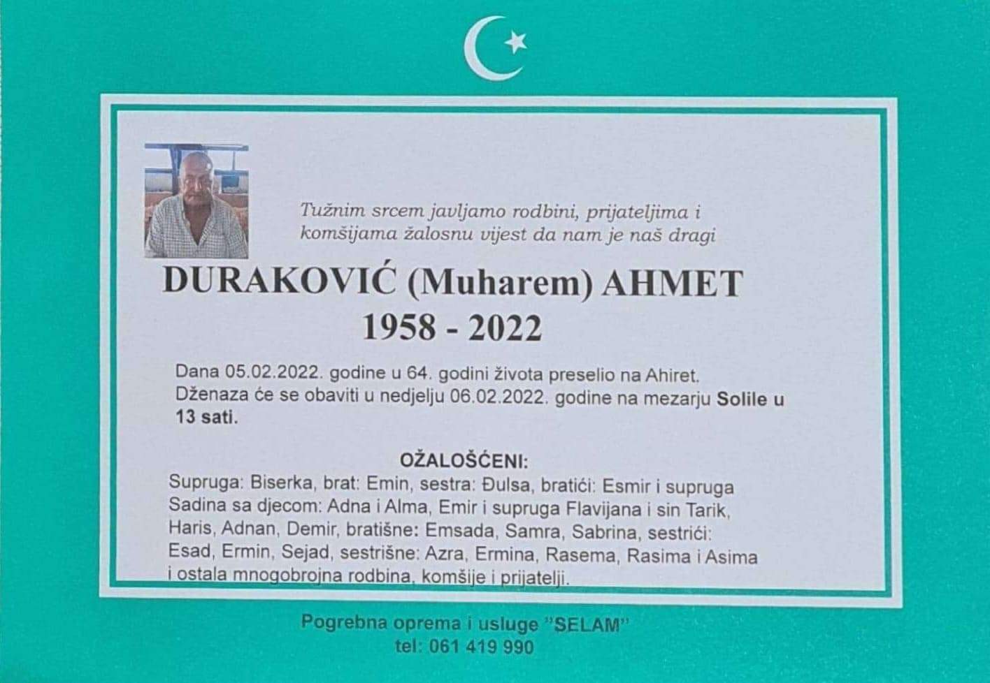 Tužnog srca i s bolom u duši obavještavamo rodbinu, komšije i prijatelje da je naš dragi Duraković (Muharem) Ahmet 05.02.2022. u 64. godini života preselio na ahiret.