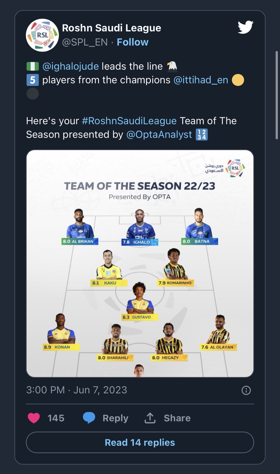Naime, Ronaldo nije uvršten u najbolji tim sezone saudijske Pro lige uprkos tome što je postigao 14 pogodaka u 19 mečeva samo na polusezoni.