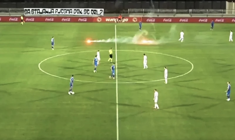 Naime, na teren su već u uvodnim minutama utakmice počela upadati pirotehnička sredstva koja su čak mogla i povrijediti igrače koji su se nalazili na centru igrališta.
