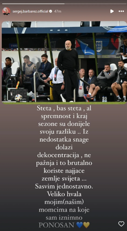 Selektor reprezentacije Bosne i Hercegovine, Sergej Barbarez, oglasio se na društvenim mrežama nakon sinoćnjeg poraza u prijateljskoj utakmici od Engleske rezultatom 3:0.