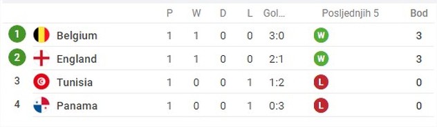 Prvi meč na današnjem rasporedu igraju Belgija i Tunis u 2. kolu grupe G od 14:00 sati. Belgijanci su u 1. kolu sasvim očekivano rezultatom 3:0 pobijedili Panamu, dok je Tunis u završnici meča poražen od Engleske (2:1).