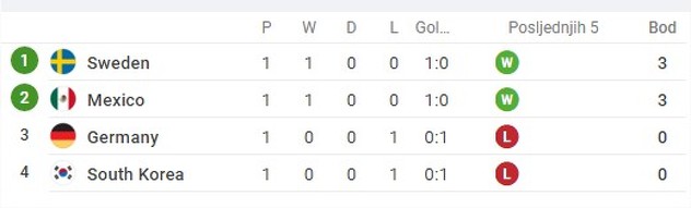 Njemačka i Švedska svoj okršaj počinju u 20:00 sati u 2. kolu grupe F. Kao aktuelni prvaci svijeta i jedni od glavnih favorita Mundijala Nijemci moraju pokazati da je poraz od Meksika bio samo loš dan. Elf protiv Švedske nema pravo na kiks tako da bi sve osim pobjede stvorilo veliki znak pitanja kada je riječ o plasmanu u osminu finala.