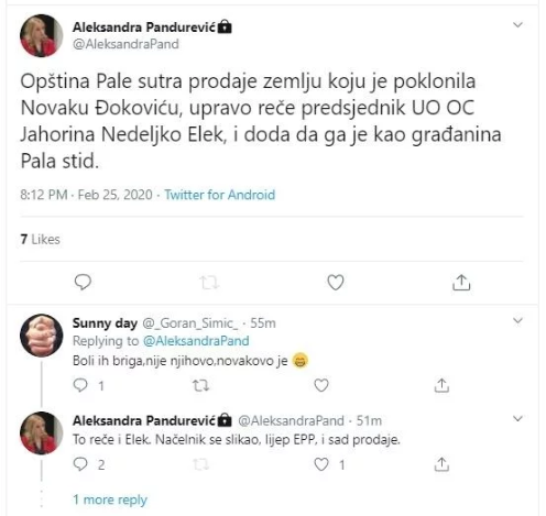- Opština Pale sutra prodaje zemlju koju je poklonila Novaku Đokoviću, upravo reče predsjednik UO OC Jahorina Nedeljko Elek, i doda da ga je kao građanina Pala stid - napisala e Pandurević na svom Twitter profilu