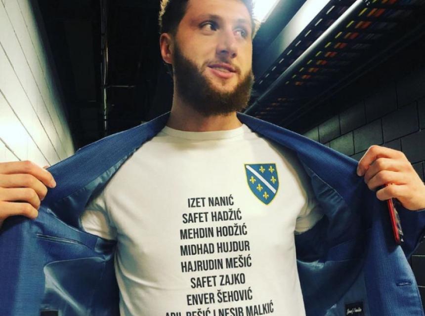 Osim što je bodrio svoje saigrače, Nurkić je na utakmici nosio bijelu majicu s grbom ljiljana i ispisanim imenima poginulih ratnih heroja.