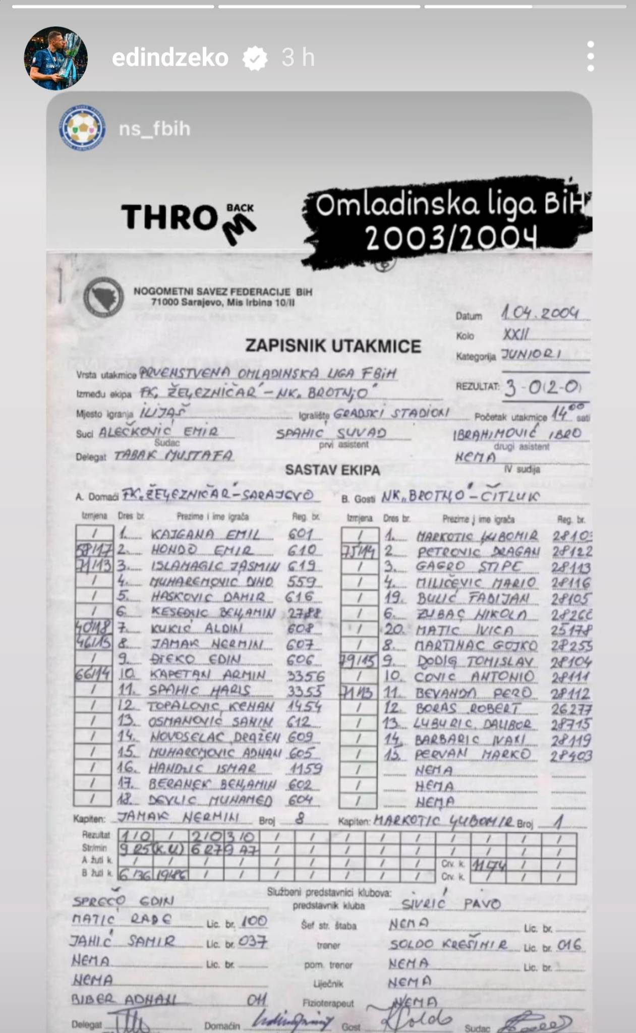 Tako su se iz Nogometnog saveza Federacije putem veoma aktivne Instagram stranice prisjetili utakmice Omladinske lige FBiH između juniora Željezničara i Brotnja iz Čitluka odigrane 1. aprila 2004. godine.