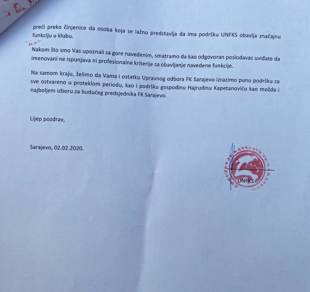 “Kako nam je rečeno u razgovoru s Kapetanovićem, on je prijedlog prihvatio nakon što mu je Zlatan Velić, trenutni Savjetnik za članstvo u FK Sarajevo, saopštio kako će njih dvojica imati podršku navijačke grupe “Horde zla”. Ovim putem Vas obavještavamo da pomenuti Zlatan Velić NIKADA neće imati podršku Udruženja navijača FK Sarajevo, niti navijačke grupe “Horde zla”, kaže se u pismu.