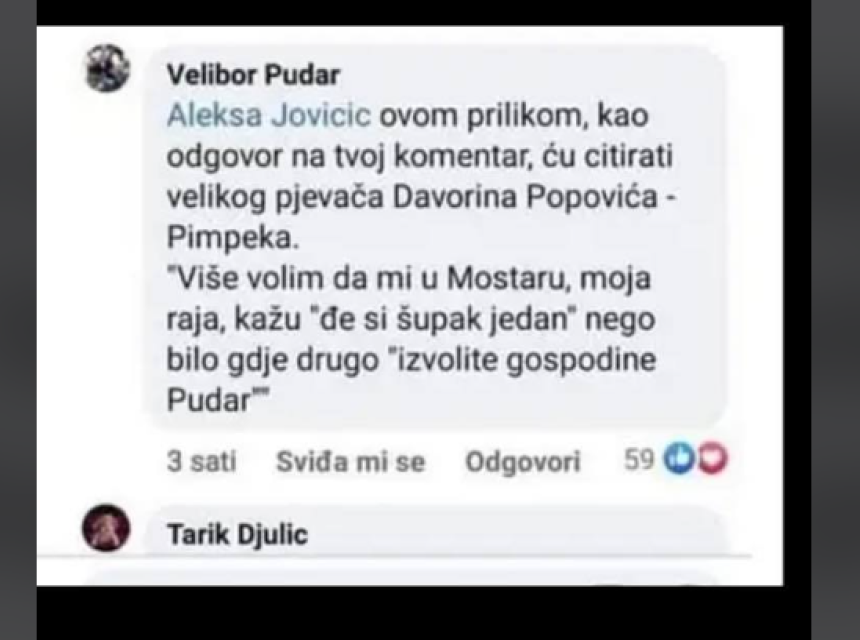 "Ovom prilikom, kao odgovor na tvoj komentar, ću citirati velikog pjevača Davorina Popovića-Pimpeka. "Više volim da mi u Mostaru, moja raja, kažu "đe si šu*ak jedan" nego bilo gdje drugo "izvolite gospodine Pudar""
