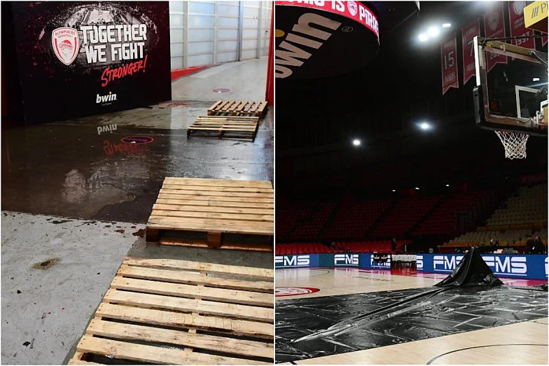 Krov dvorane je danas počeo da prokišnjava, a iako ljudi iz Olympiacosa rade sve što mogu da spriječe veću štetu, jednostavno nije moguće da se utakmica odigra.