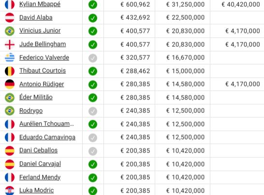 Luka Modrić je ove sezone zarađivao 10.4 miliona eura, pa će Arnold i njega preskočiti, a iznad njega će biti Kilijan Mbape (Kylian Mbappe - 31.2), David Alaba (22.5), Vinisijus Žunior (Vinicius Junior - 20.8), Džud Belingem (Jude Bellingham - 20.8), Federiko Valverde (Federico - 16.6), dok je Tibo Kurtoa (Thibaut Courtois) na 15 miliona eura godišnje plate.