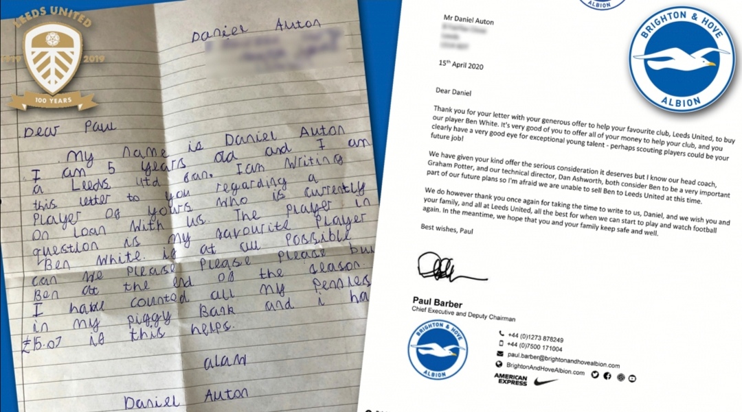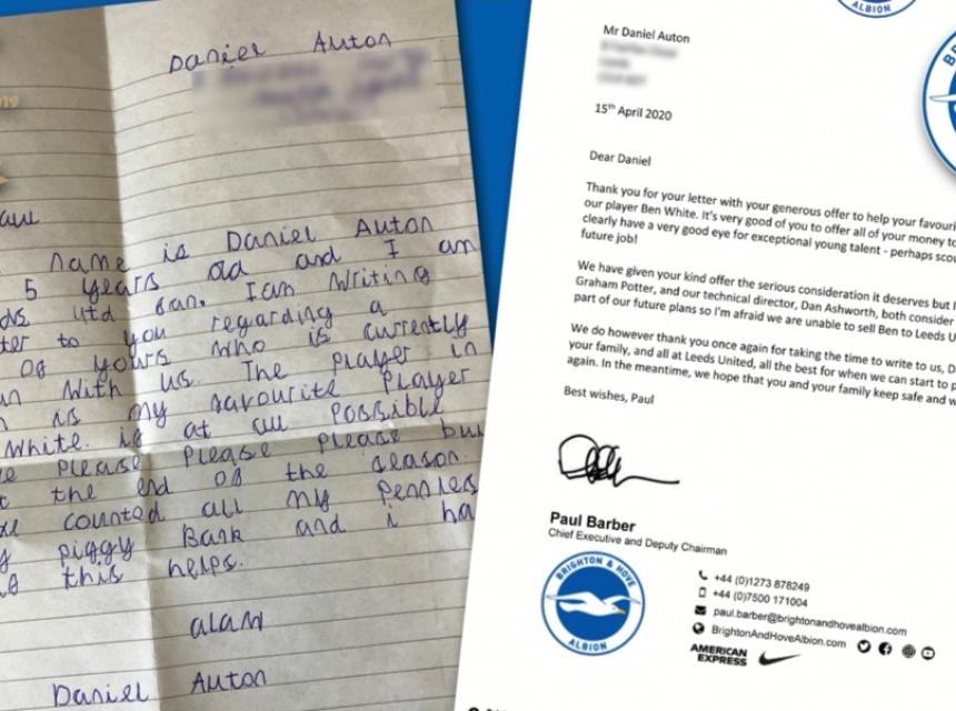 "Moje ime je Daniel Auton. Imam pet godina i navijač sam Leeds Uniteda. Pišem vam ovo pismo zbog vašeg nogometaša koji je trenutno kod nas na posudbi. Ben White je bez ikakve sumnje moj najdraži igrač. Ima li ikakva mogućnost, molim vas, molim vas, molim vas da on ostane kod nas i naredne sezone. Prebrojao sam sve novčiće iz svoje 'kasice prasice' i imam 15.07 funti. Da li to pomaže?", napisao je dječak.