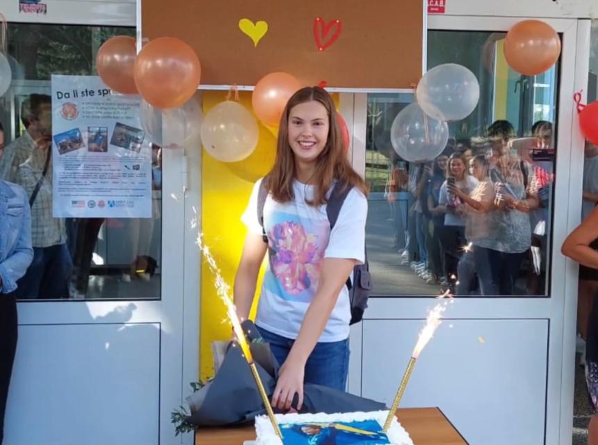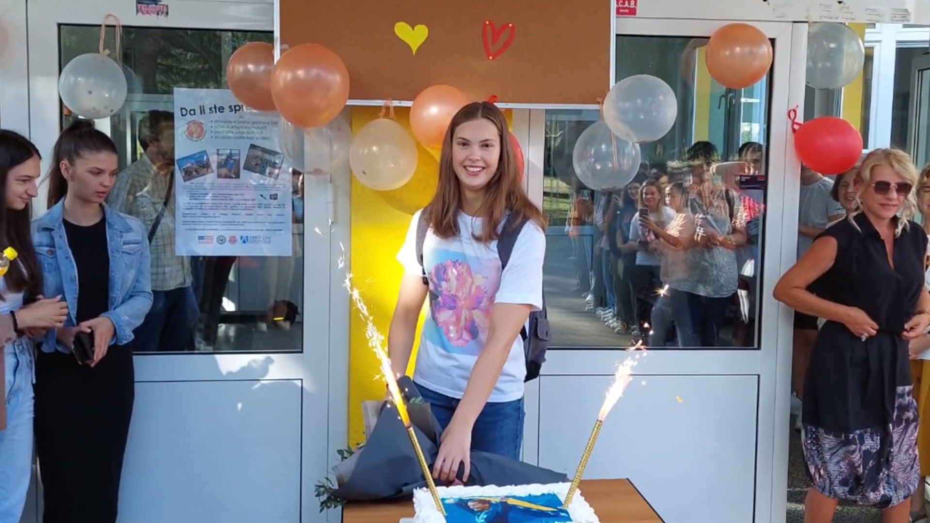 Najboljoj bh. plivačici priređen je špalir od njenih kolega iz školskih klupa, a Lanu je dočekao buket cvijeća, kao i torta uz legendarni hit „Svijet voli pobjednike“.