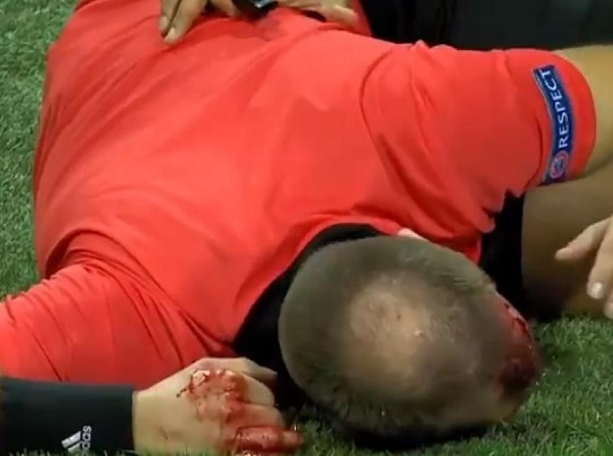 Švedski sudija Frederik Klyver završio je krvav na travnjaku i prebačen je u bolnicu gdje mu pružena pomoć i ušivena mu je glava.