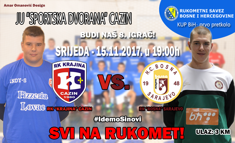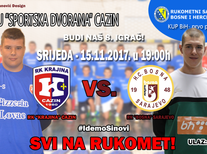 Utakmica, RK Krajina Cazin - RK Bosna Sarajevo igra se u srijedu 15.11.2017 s početkom od 19:00, u sportskoj dvorani Cazin.