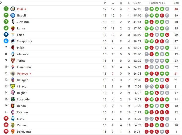 Nakon nekompletnog 17. kola Inter je prvi sa 40 osvojenih bodova, i sada ima jedan, odnosno dva boda više od Napolija i Juventusa koji svoje mečeve tek trebaju odigrati, dok je Udinese ovom pobjedom stigao do 11. pozicije i nakon 16 odigranih utakmica ima 21 osvojen bod.