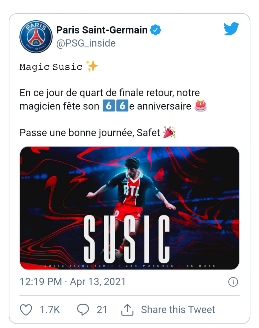 Sva pažnja PSG-a je usmjerena prema Ligi šampiona, odnosno uzvratnoj utakmici četvrtfinala protiv Bayerna, ali to nije bio razlog da se ne sjete Safeta Sušića i čestitaju mu 66. rođendan.