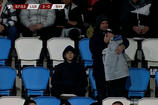 Dječak je bio u zagrljaju osobe koja je na tribini bila uz njega, vjerovatno svog oca koji ga je pokušavao utješiti.