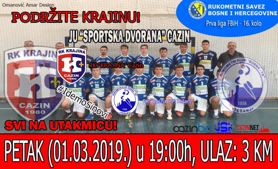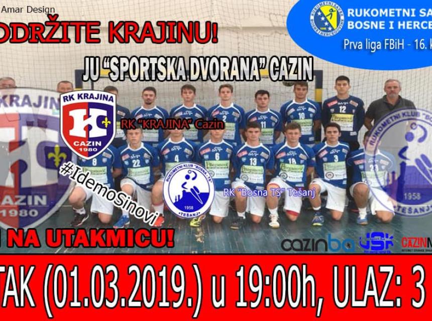 U petak 01.03.2019 Rukometni klub Krajina Cazin igra svoju drugu utakmicu proljetnog dijela prvenstva Prve lige F BiH Grupa sjever, gdje će na domaćem terenu ugostiti ekipu RK Bosna TS Tešanj.