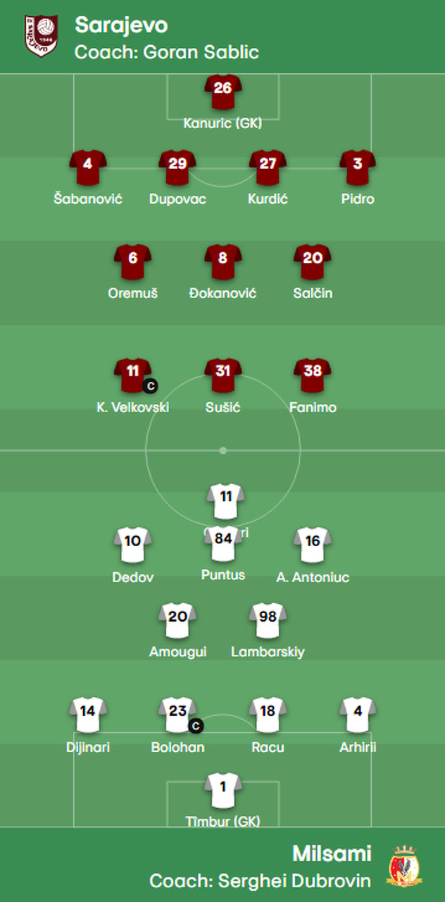 S druge strane, trener Milsamija Serghei Dubrovin se odlučio za znatno defanzivniju postavku u formaciji 4-2-3-1. U prvom sastavu su: Timbur; Arhirii, Racu, Bolohan, Dijinari; Lambarskiy, Amougui; Dedov, Puntus, Antoniuc i Ginsari.