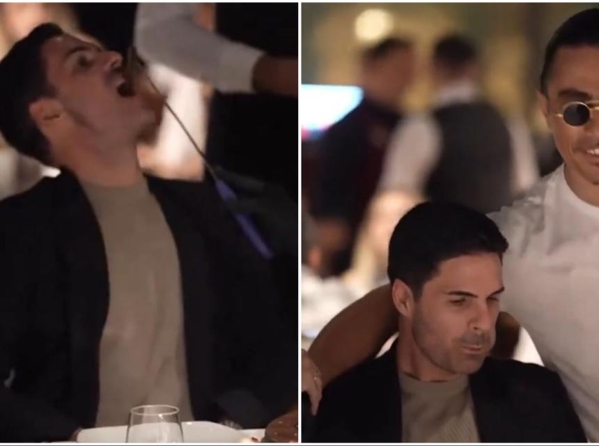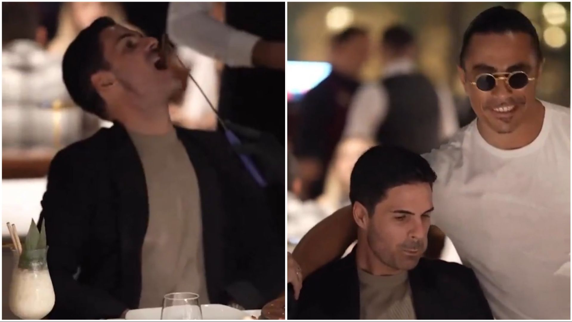 Na snimci se vidi kako Arteta gleda Gokčea kako reže odrezak, a zatim mu kuhar stavlja komad mesa u usta.